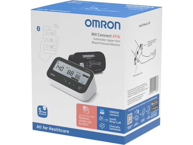Το OMRON M4 Connect AFib είναι ένα προηγμένο, κλινικά πιστοποιημένο έξυπνο πιεσόμετρο μπράτσου, σχεδιασμένο για ακριβή και αξιόπιστη μέτρηση της αρτηριακής πίεσης και έγκαιρη ανίχνευση κολπικής μαρμαρυγής (AFib). Χάρη στην καινοτόμο τεχνολογία Intellisense AFib, συμβάλλει στη μείωση του κινδύνου εγκεφαλικού επεισοδίου έως και 66%, μέσω της έγκαιρης αναγνώρισης ανωμαλιών στον καρδιακό ρυθμό.