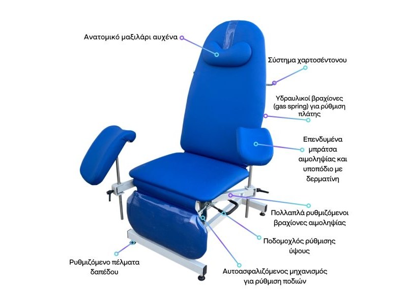 The HAEMOSTAR LUX 5903 chair is designed for comfort, safety, and efficiency in phlebotomy and endocervical sampling procedures. Expertly designed and manufactured in Greece, it combines functionality with ergonomic design.