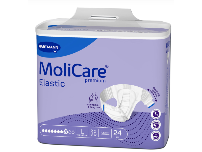 The MoliCare® Premium Elastic 8 drops adult incontinence briefs are designed for men and women with severe incontinence, delivering maximum absorbency, protection, and comfort for both day and night use.