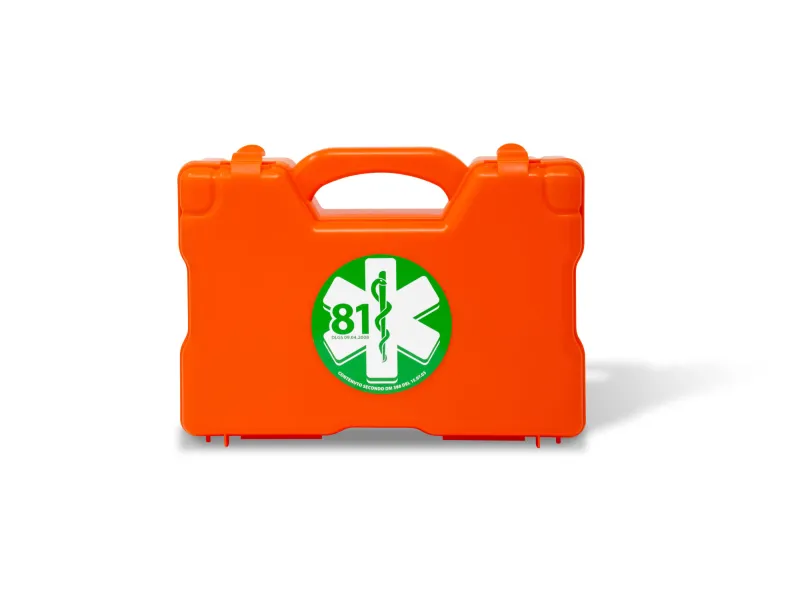 The pharmacy case is made of polypropylene, resistant to bumps, in orange color, can be hung on the wall by special holes at the back of the case, has a carrying handle and 2 swivel locking clips.