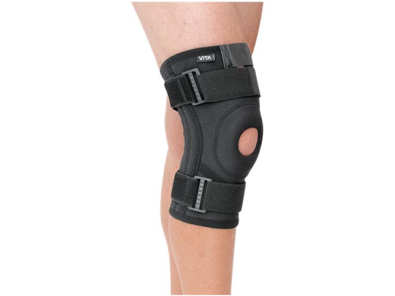 Velcro knee brace with patella hole and spiral stays 06-2-036 is made from lightweight, high-quality neoprene, providing compression, stability, and support to the knee joint. It features two adjustable Velcro straps, four flexible spiral stays to support the collateral ligaments, and an anatomical patella stabilization pad.