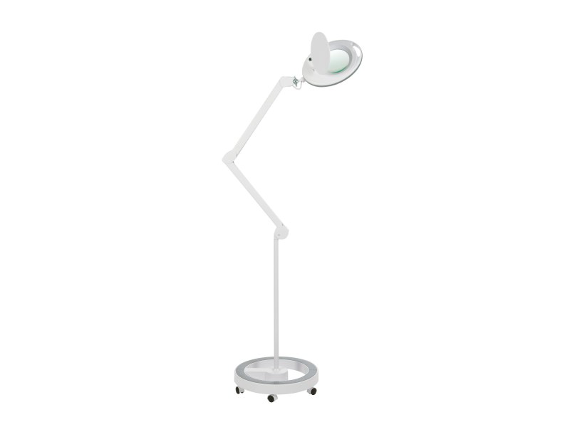 Cold light LED lamp with 5-dioptres magnifying lens and brightness adjustment. It comes with a high stability 5 wheels base and an articulated arm for easy movement and fixing of the lamp.